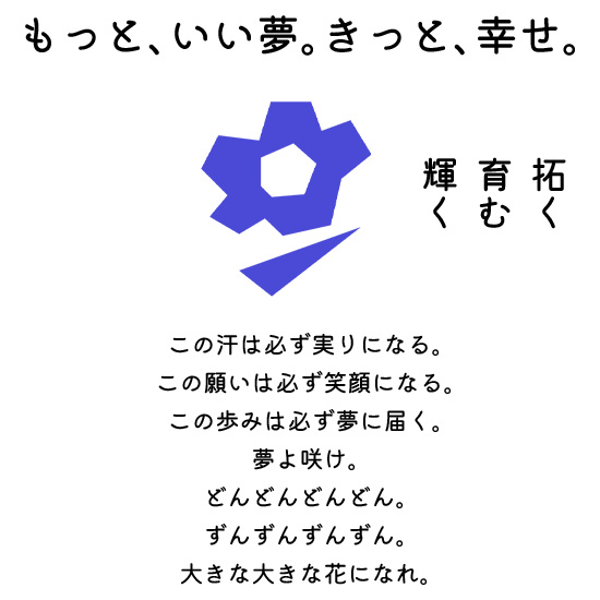 見事に咲いた大輪は、夢が咲き、果実を収穫する喜びを示しています。また、右上方へ向かって上昇する鋭角的三角形は、未来を見つめ大いなる可能性にチャレンジする強い意志と若々しい力を象徴しています。
