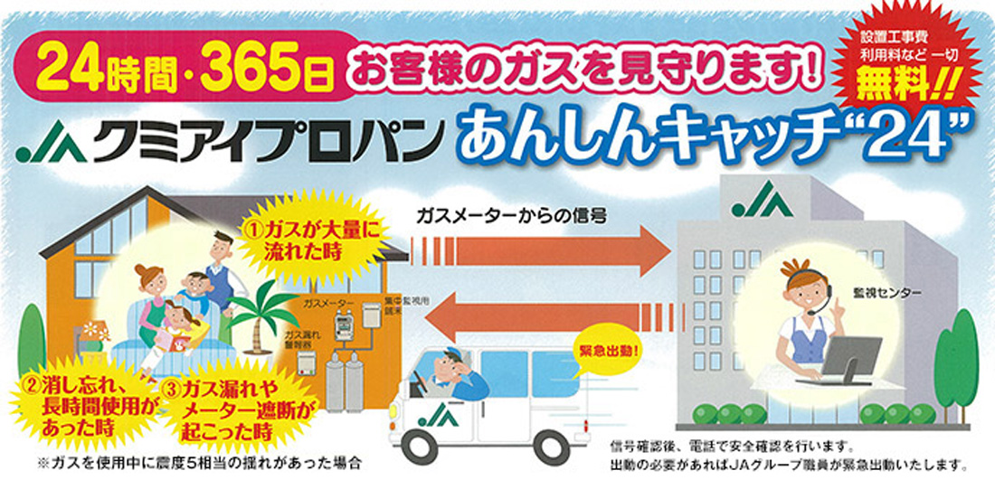 24時間・365日見守る「あんしんキャッチ24」を導入し、安心、安全なガスをお届けしています。また、お客様のお宅に伺い、定期的に無料点検を実施しています。最新のガス器具もご提供し、皆さまの快適な暮らしづくりのお手伝いをいたします。
