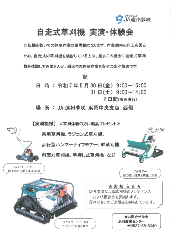 自走式草刈機の実演・体験会をチラシのとおり開催いたします。