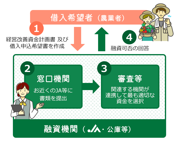 ご融資は青年農業者等育成センター又はJA等から行います。JA等が行う融資は就農施設等資金のみですが、農業信用基金協会の債務保証を受けることができます。